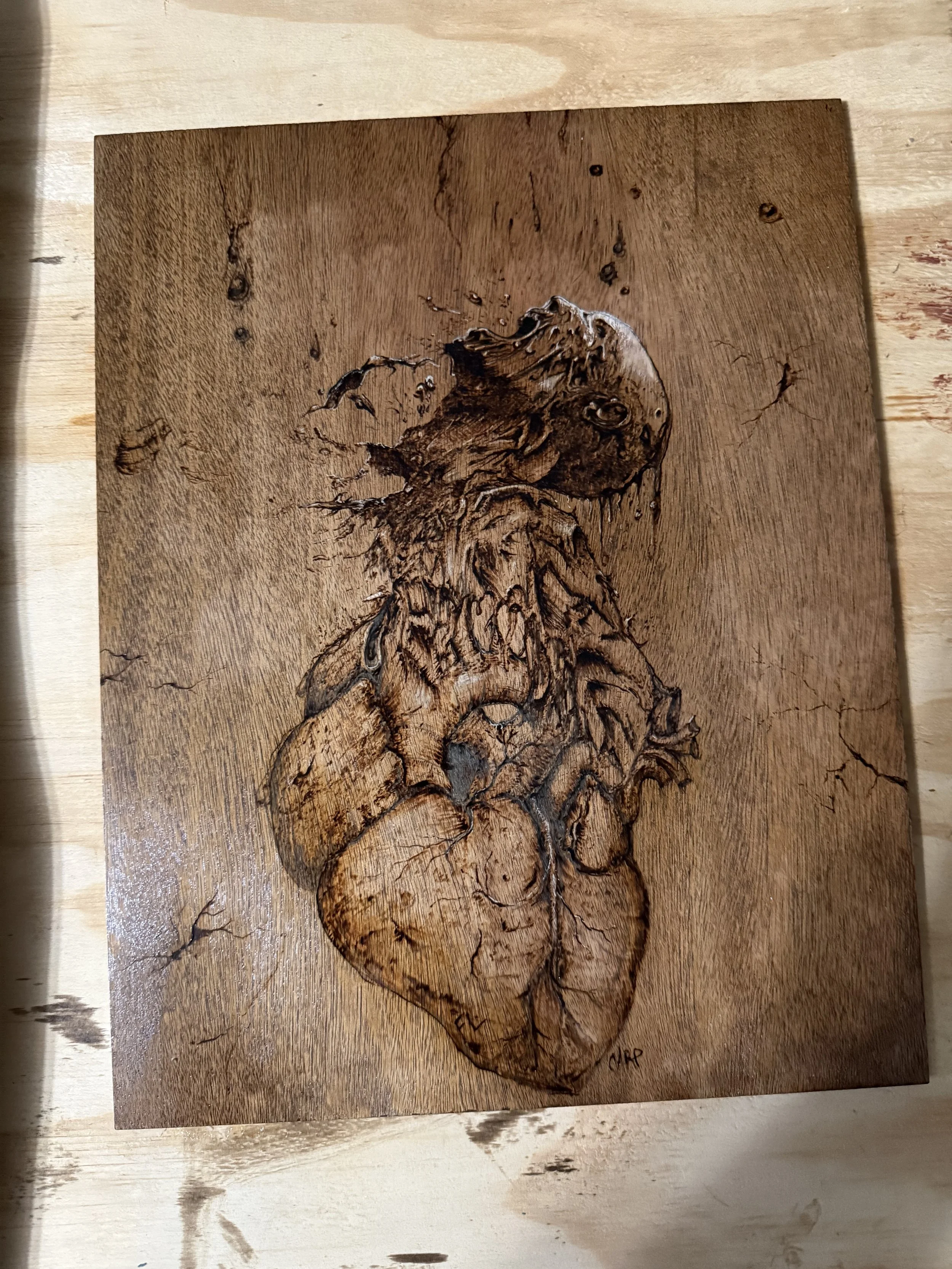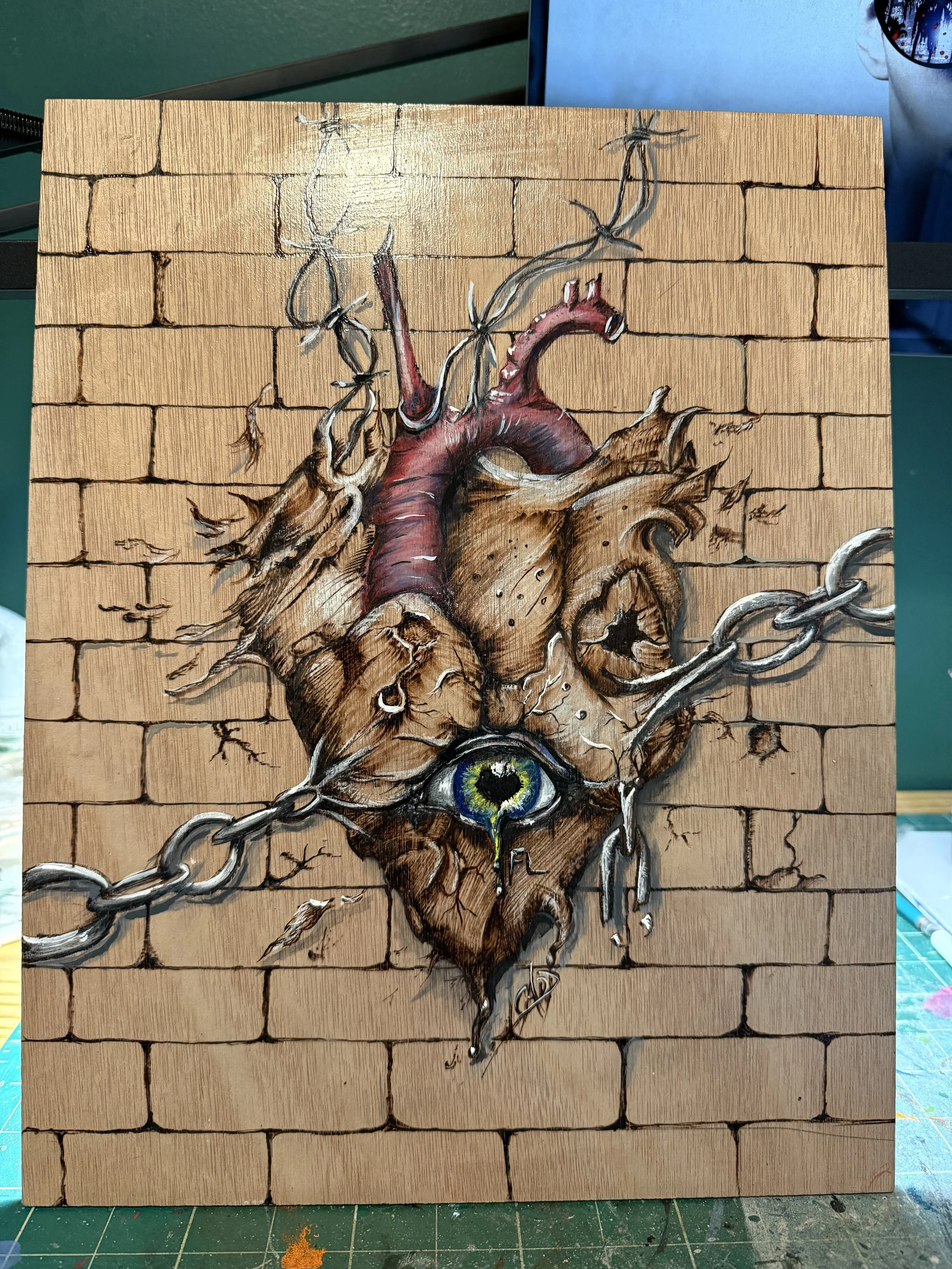 Sale Price: $175.00 Original Price: $200.00 Sold out $150.00 Wood burn heart with eye $150.00 Blue Skull $150.00 Woodburn 11x16 Heartbreak $150.00 Heartbreaker $20.00
